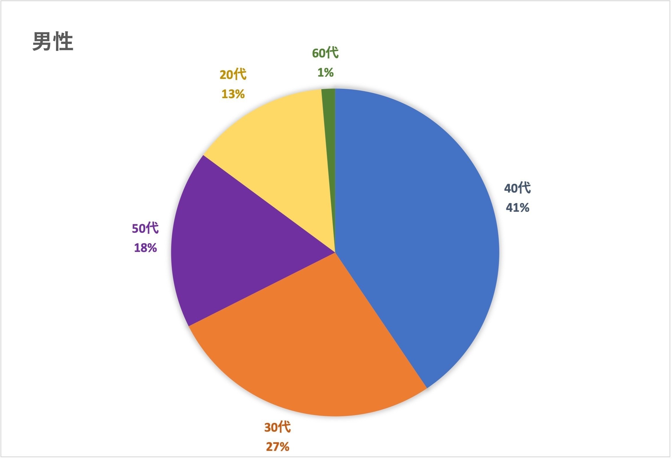 男性は、40代が最も多く、次いで30代、50代、20代、60代です。